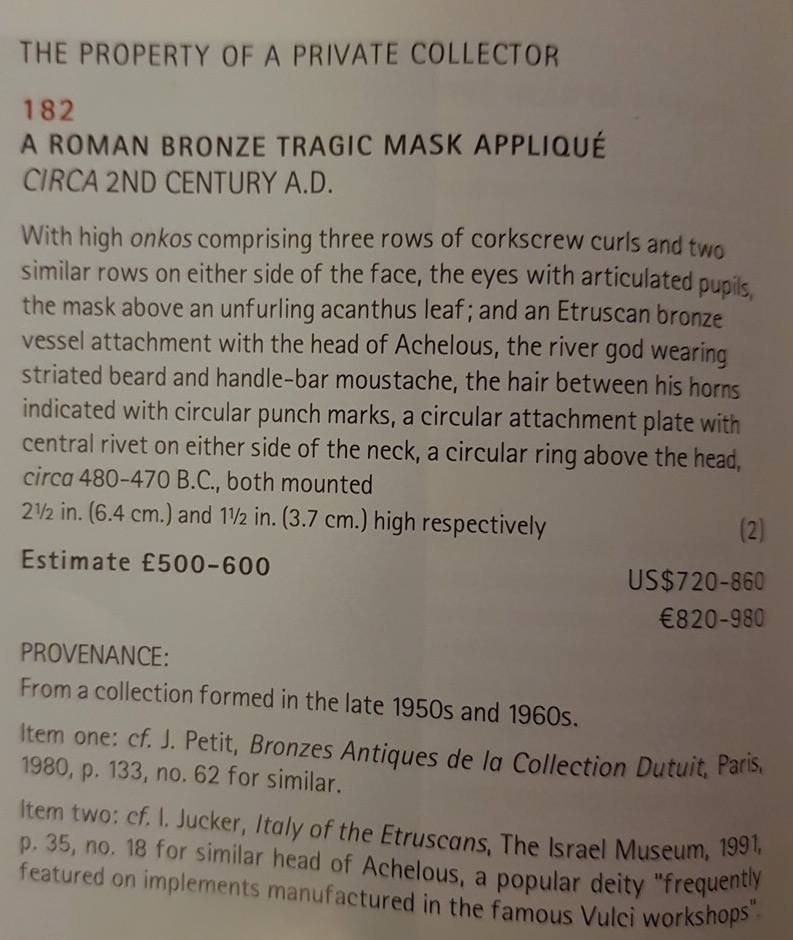 Unlike last time, when I strangely selected an auction that took place at the very moment of my birth pulled at random from a box, today’s catalogue was one that got misfiled somehow and was just floating around on top of the other boxes of catalogues. “Antiquities, Christies’s South Kensington, 14–15 May, 2002” selected itself.